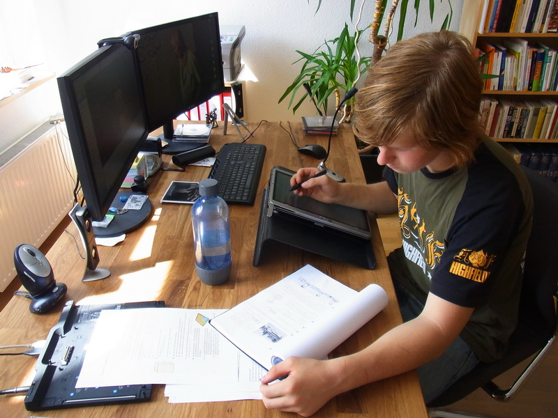 The classic way: use of the own PC with a big screen for the transmission of the video telephony and learning materials required in the lessons. On the other hand a small tablet PC is used as exercise book “substitute”. Both PCs are directly connected to the teacher, who can see in real time what the student is doing.
